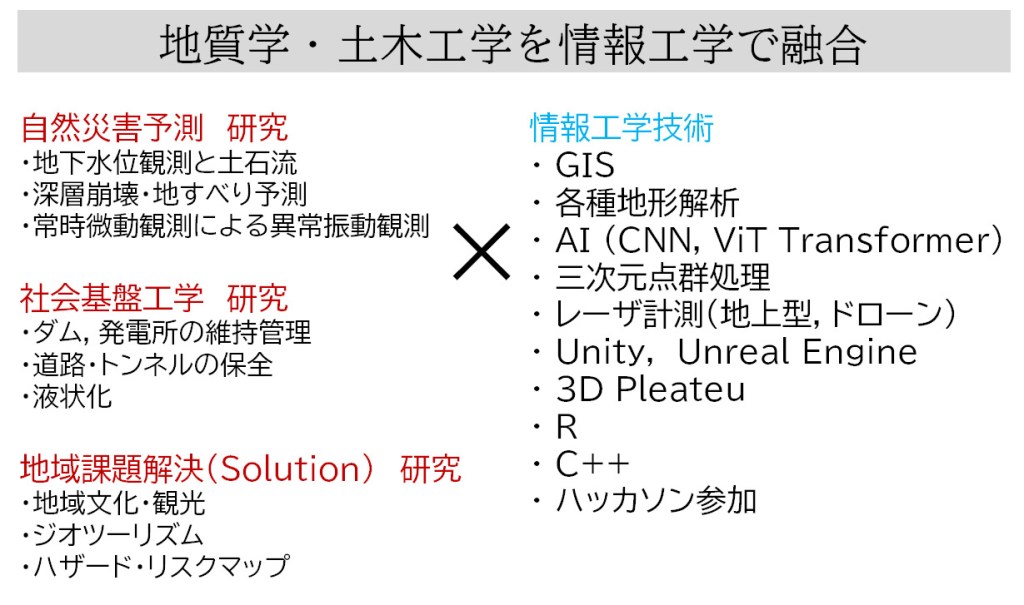 理学的な重力変形の理解,工学的なモニタリング手法の実施と,これらを結び付ける情報工学で,自然災害における防災減災に貢献します.