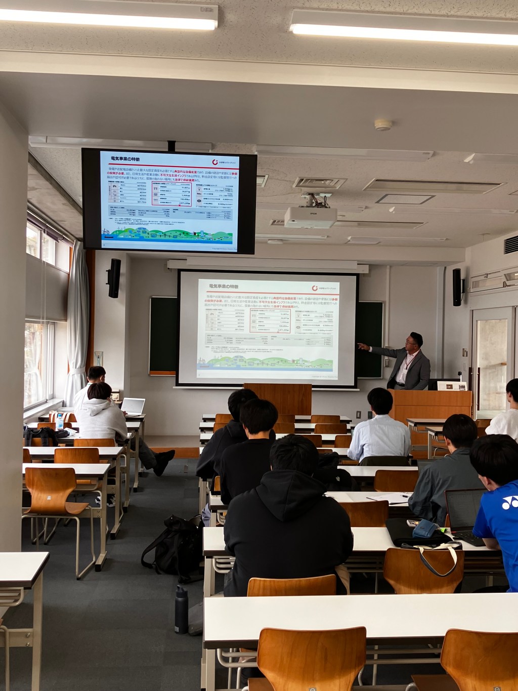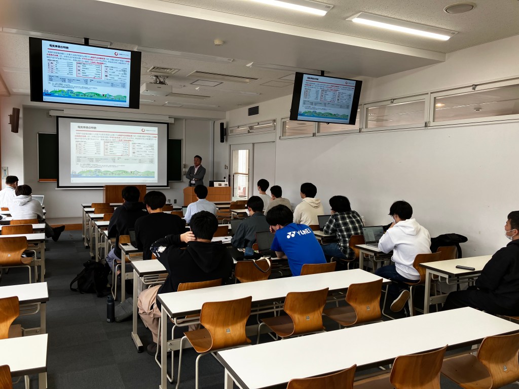 11月29日(金)2限に業界説明会を行いました!今回は菊地研究室と機械電気工学科の小川研究室とのコラボで,中部電力パワーグリッドの福永さん(本学 特任准教授)をお招きし,エネルギー業界と工学のかかわりについて論じていただきました!