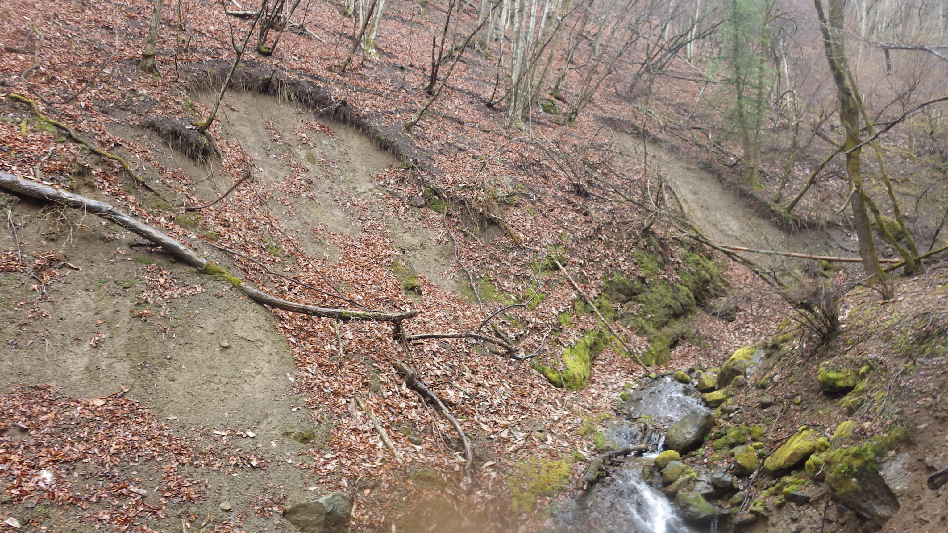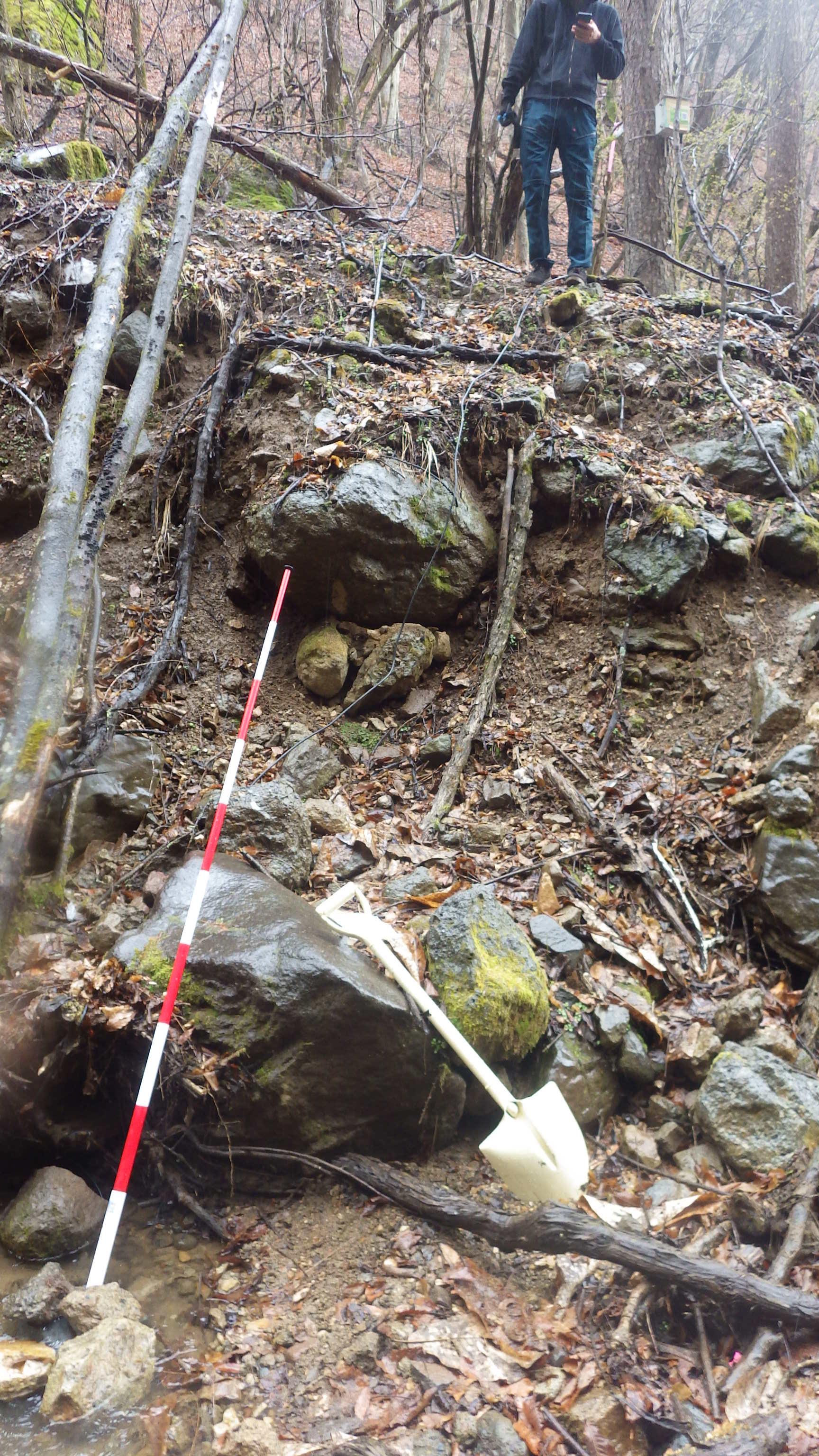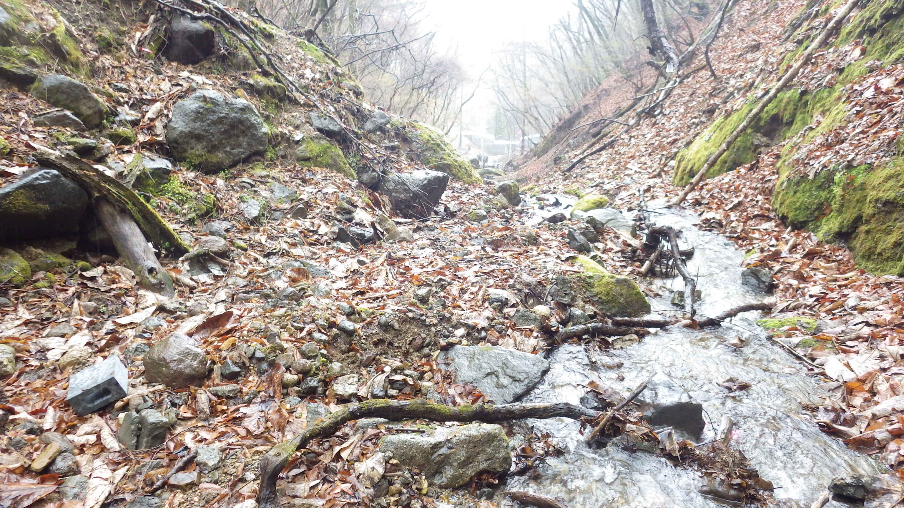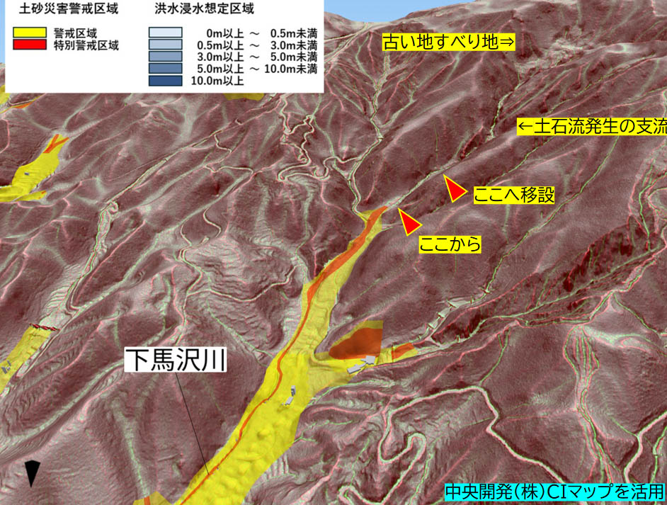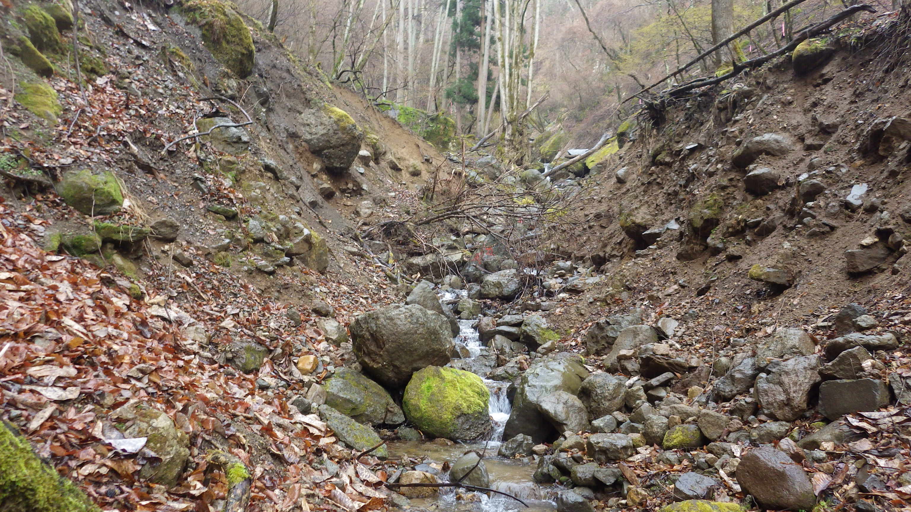 下馬沢川は,右岸側に表層崩壊が連続して認められます.左岸側には土石流による堆積物が2m以上あり,今後も土砂を排出することが明らかでした