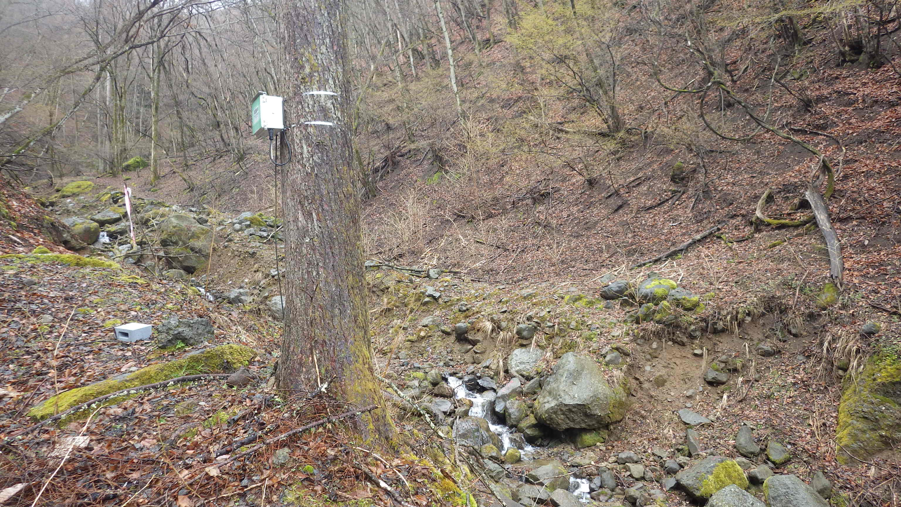 当初設置の水位計の状況.すぐ下流には土石流防護のネット(感知センサ?)と堰堤が設置されています