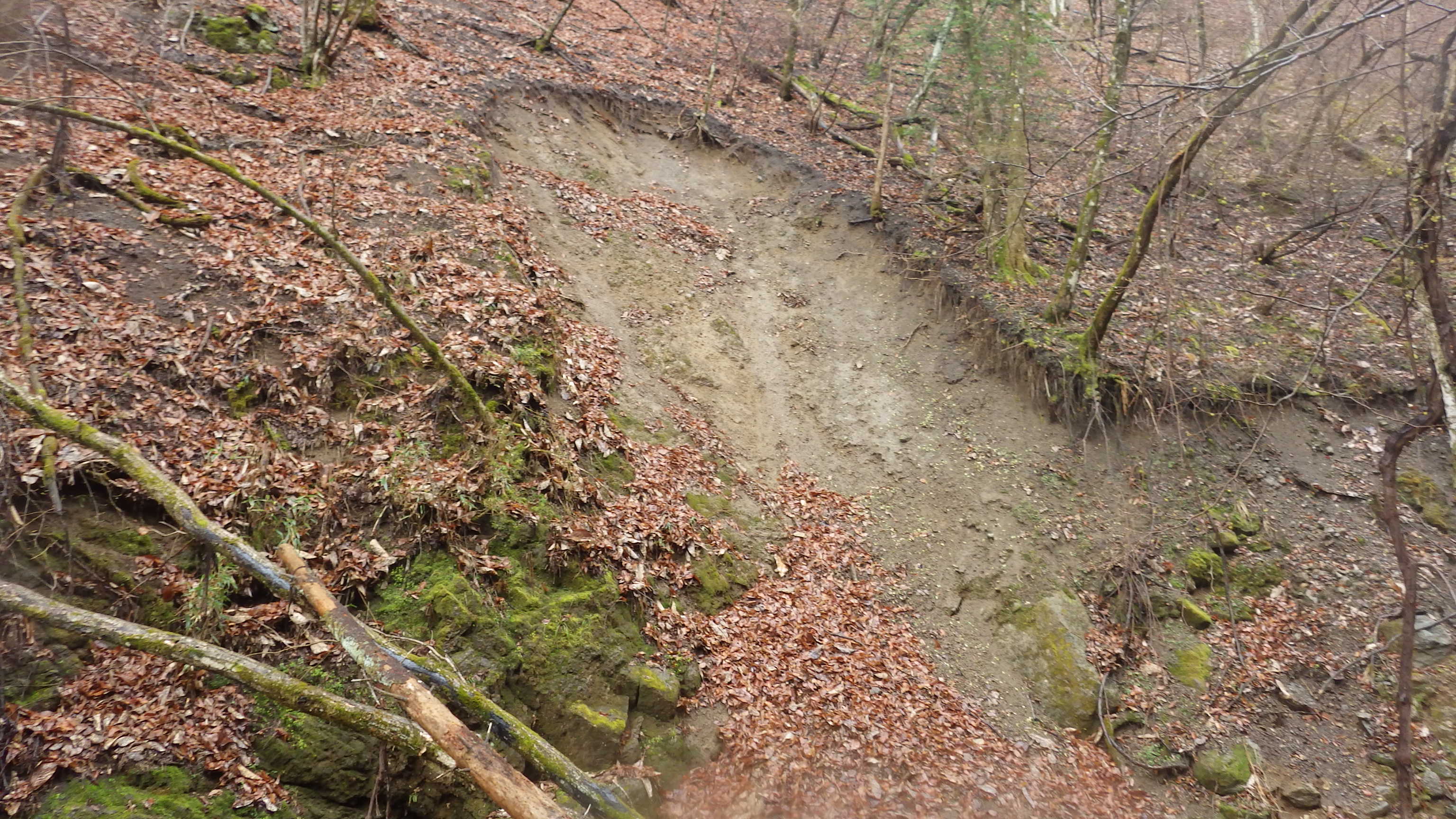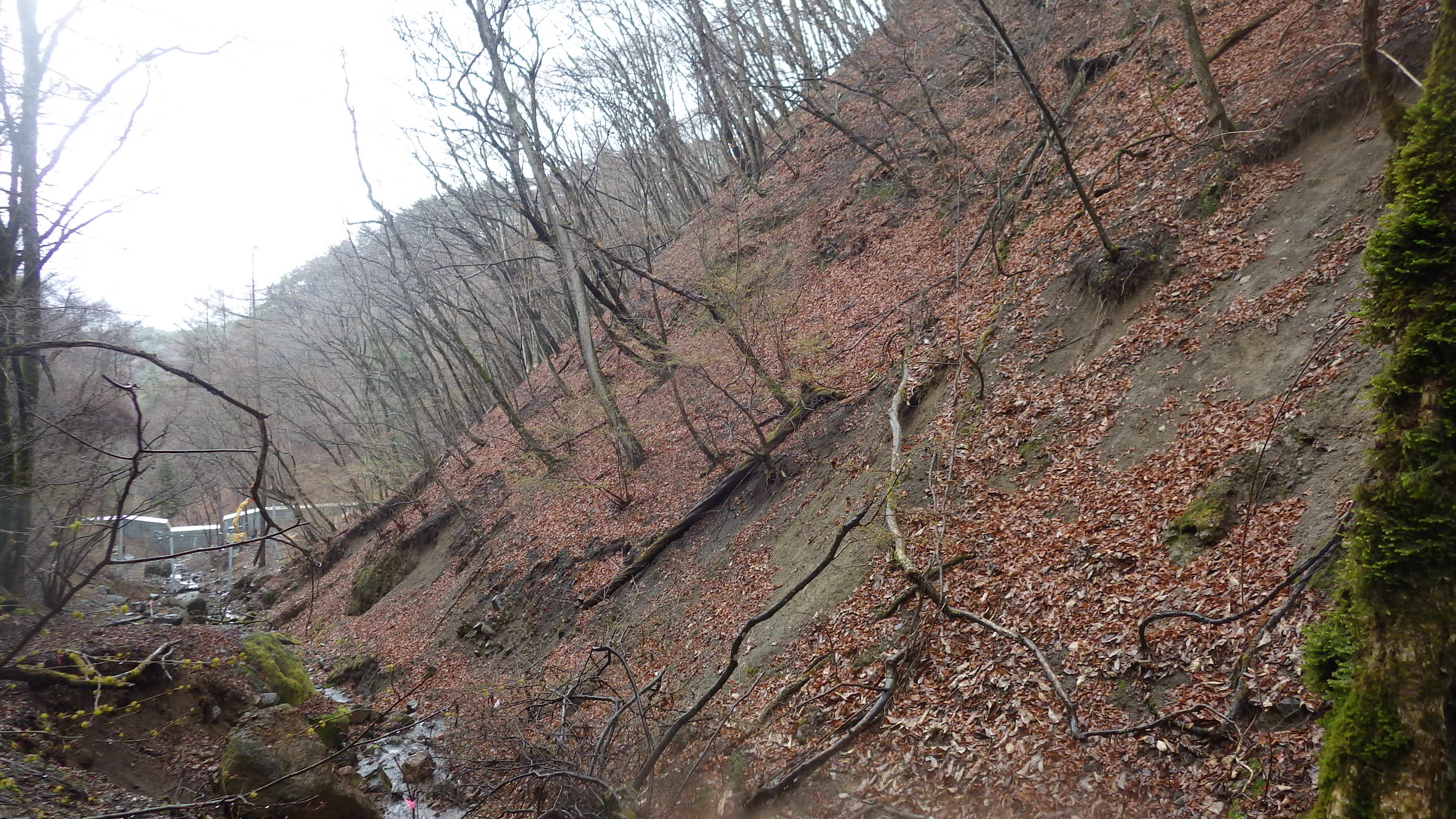 右岸側は表層崩壊の連続です.今後も横方向,鉛直方向にも崩壊は進みそうです.