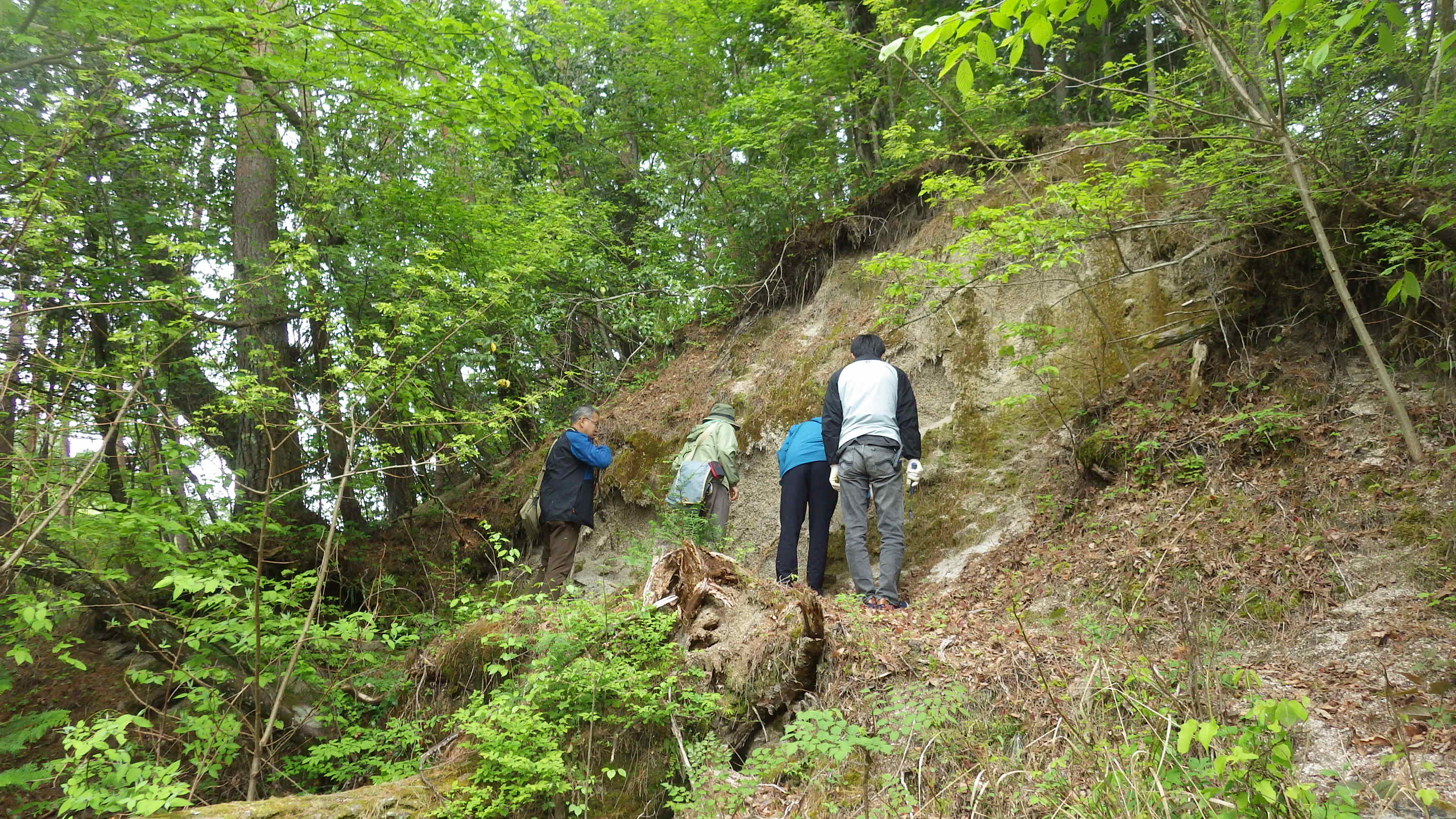 大鹿村から駒ヶ根市は、三六災害で大きな被害を受けた地域ですが、その範囲は、花崗岩のマサ化分布域と密接な関係があります。これらの痕跡を調べ標高分布とマサ化の進行を露頭で見る事ができました。これは地元の宮崎さんに現地案内して頂き、学生も勉強になりました。