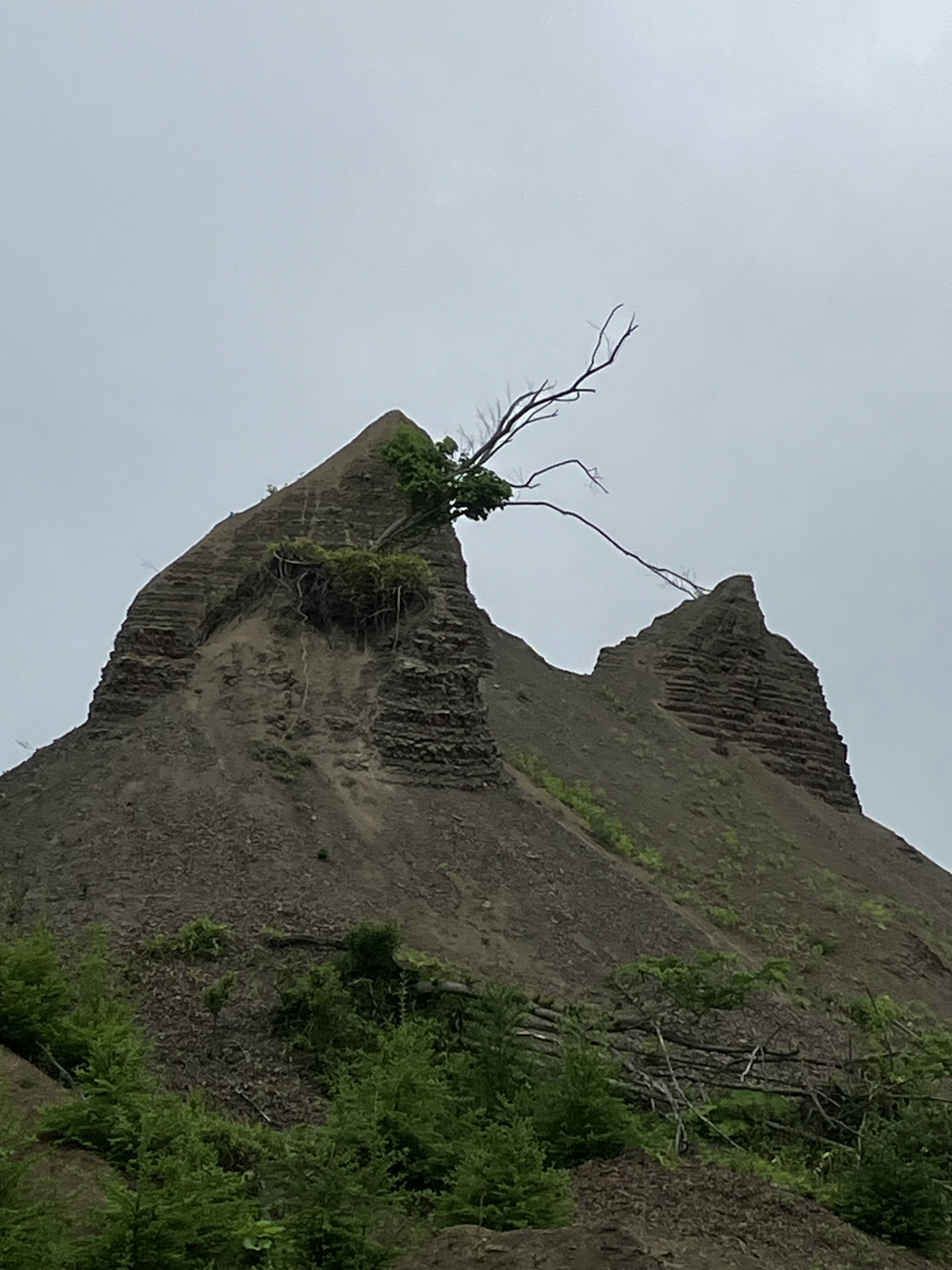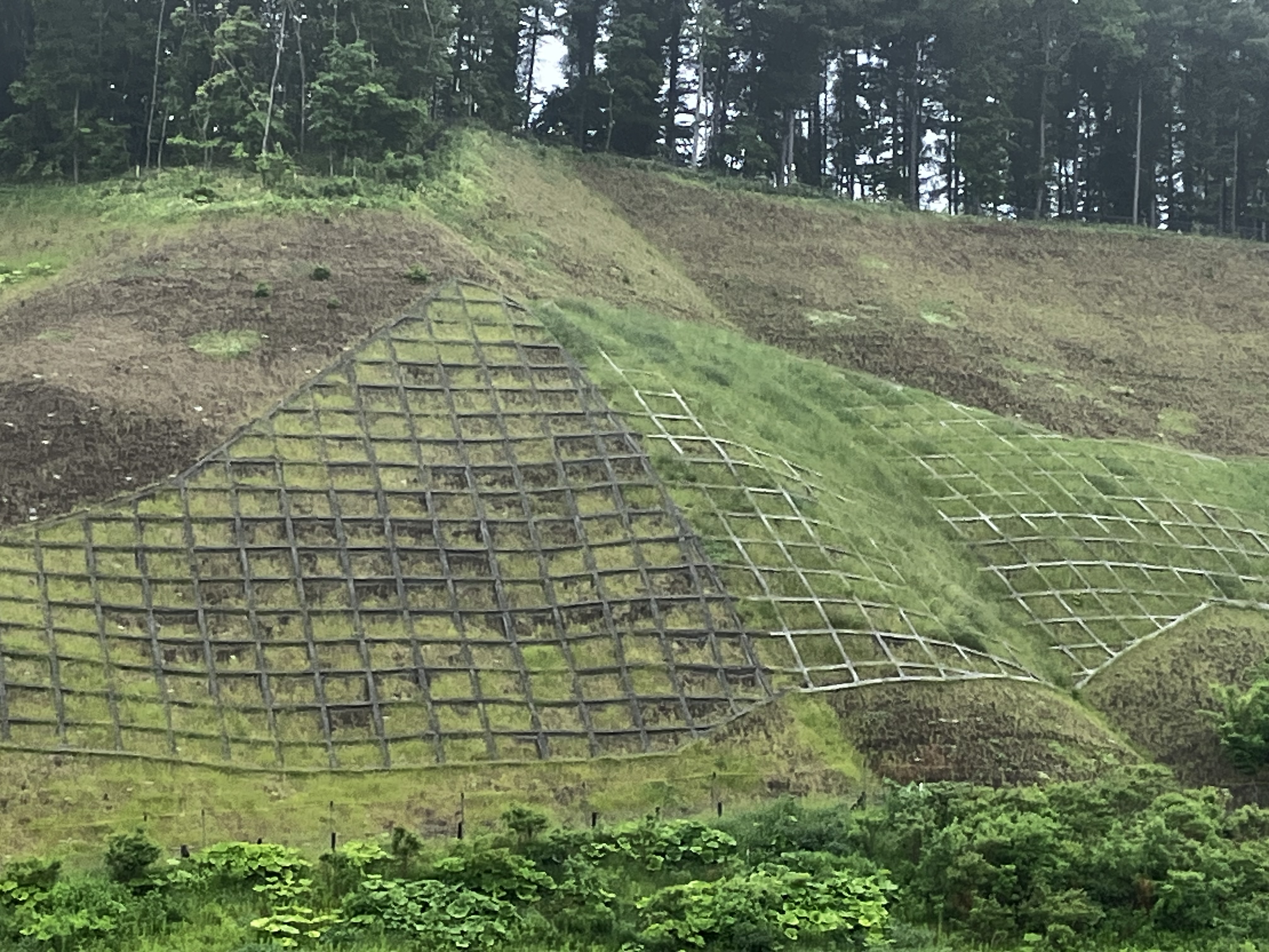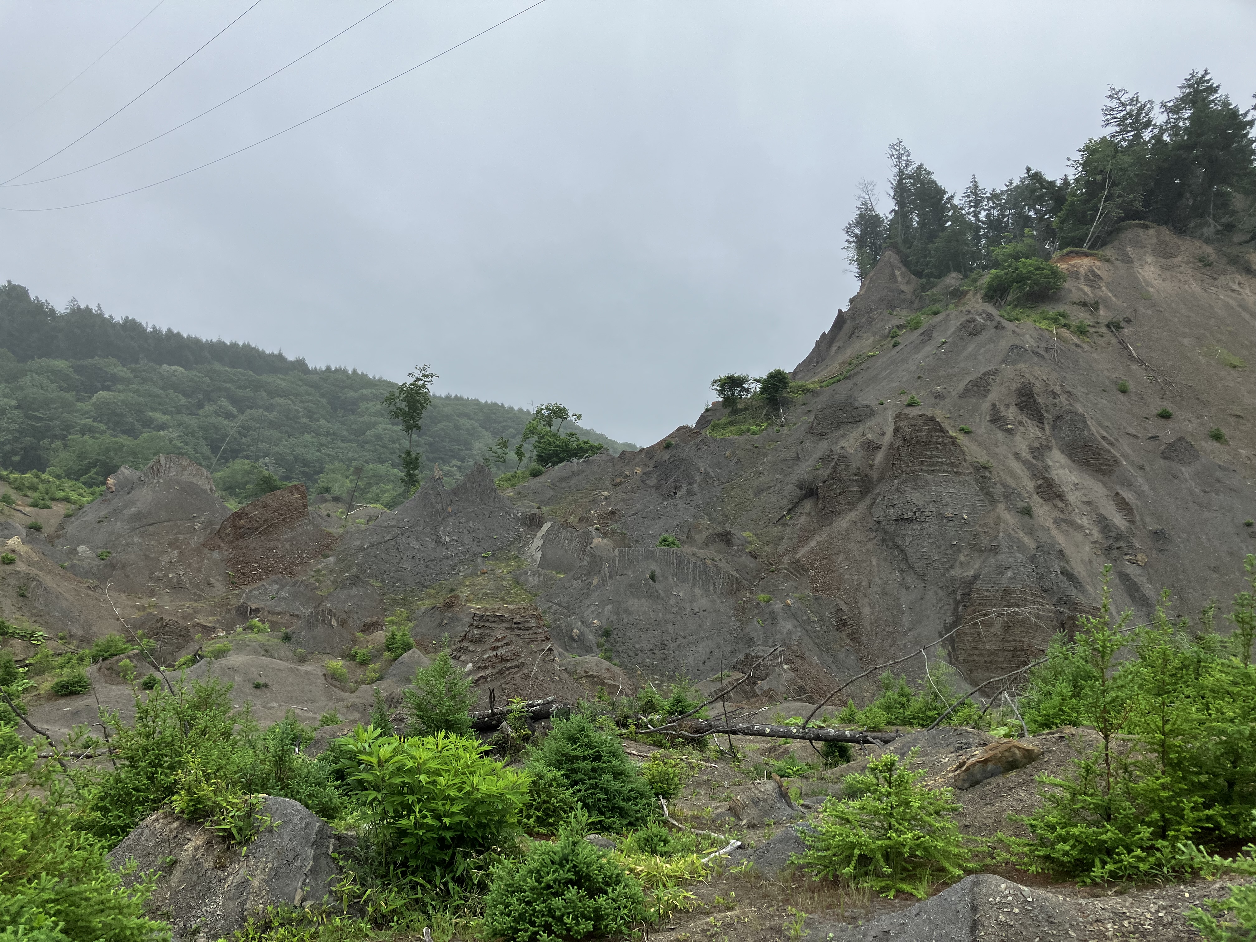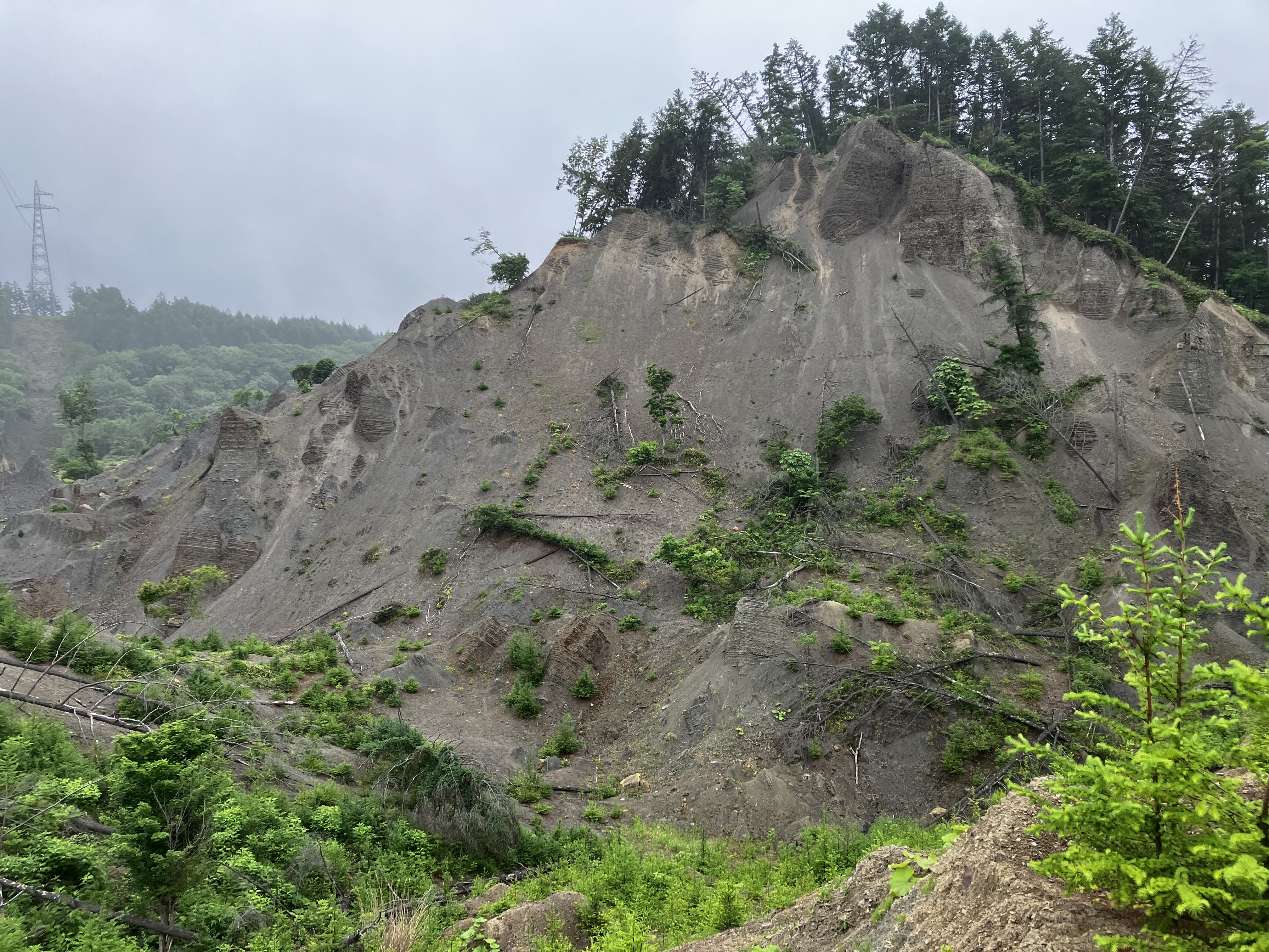 同行していただいた寒地土研の山崎さん(主著者は伊東さん)が2021年に詳細な報告をされていますが、北北西-南南東の背斜構造(ほぼ水平)となっている尾根が選択的に地すべりとなっていることを説明いただきました。